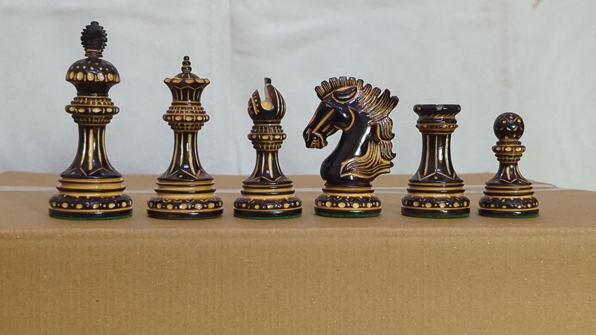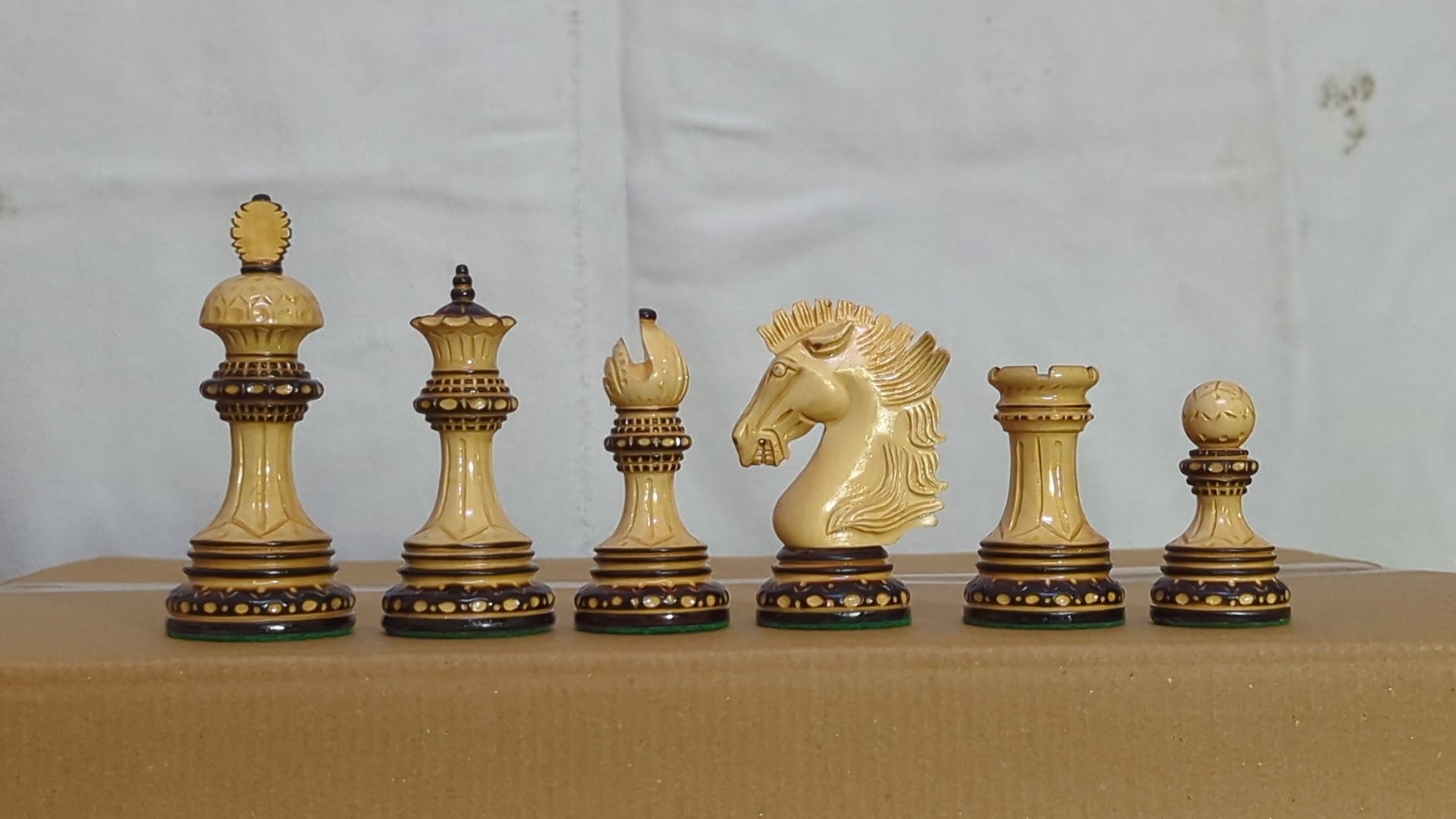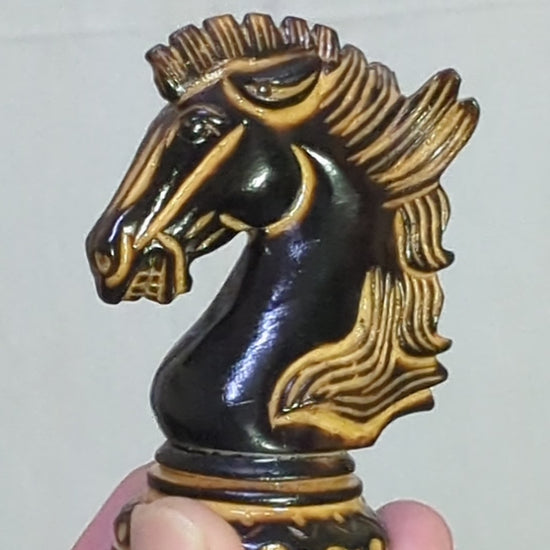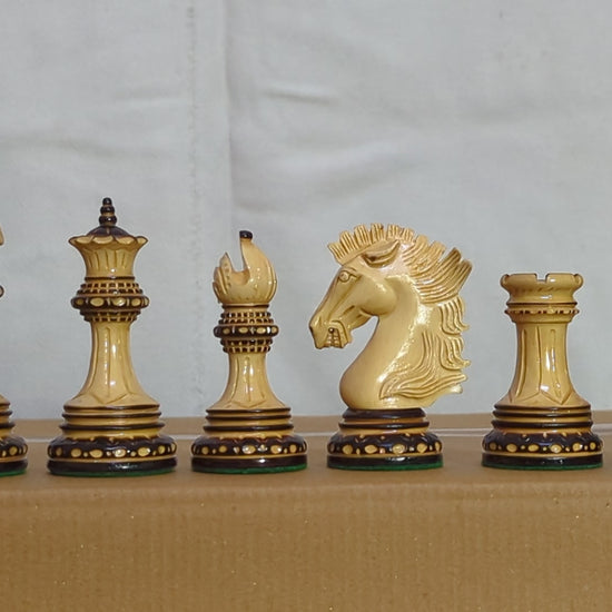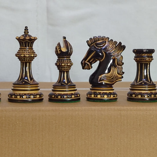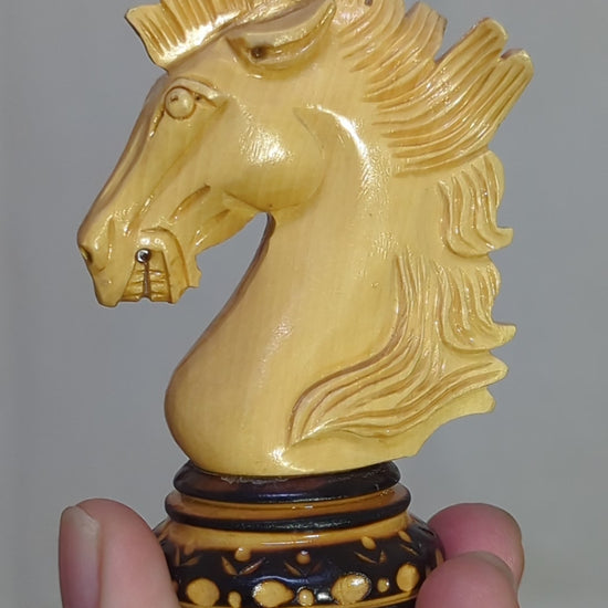 LUXURY WOODEN CHESS PIECES - Purely Handcrafted - Made of Burnt Boxwood and Boxwood. Knight is elegantly carved as a Show Topper on the chess board.
