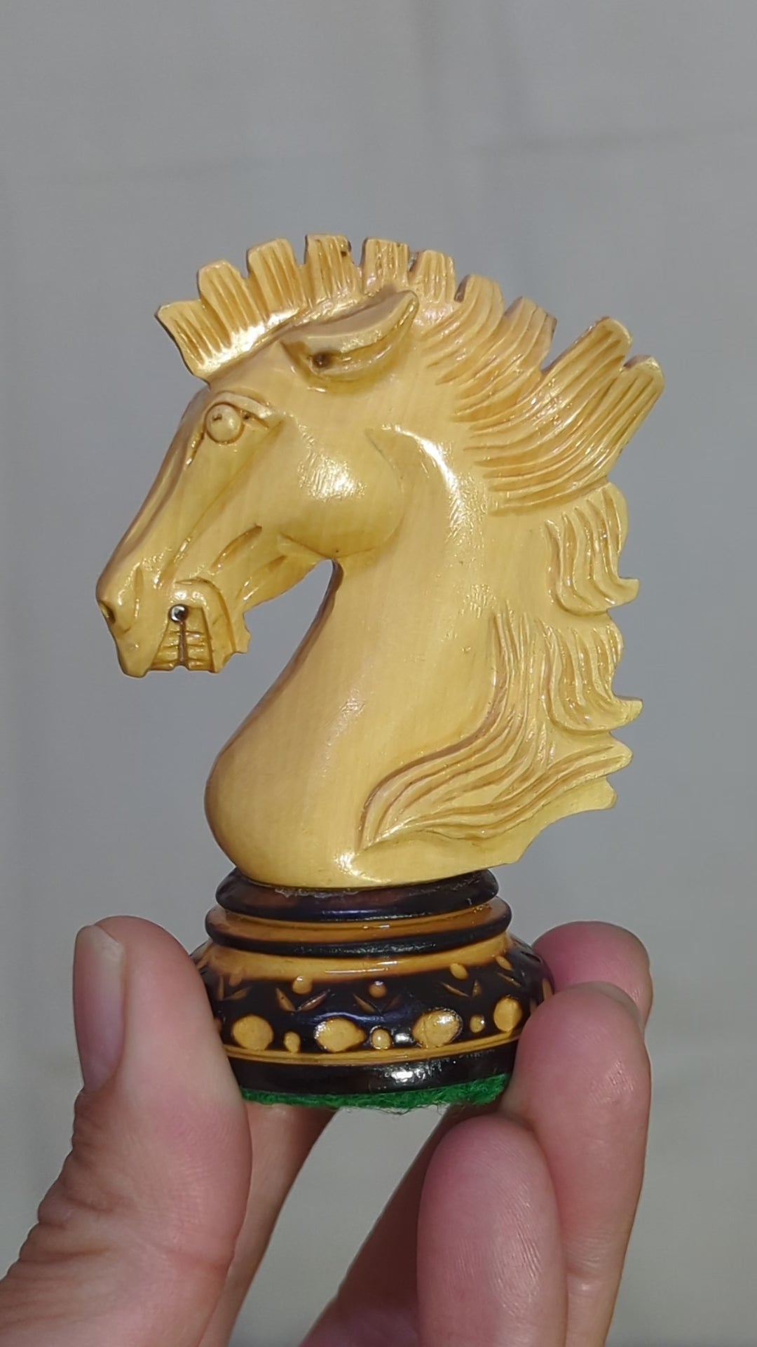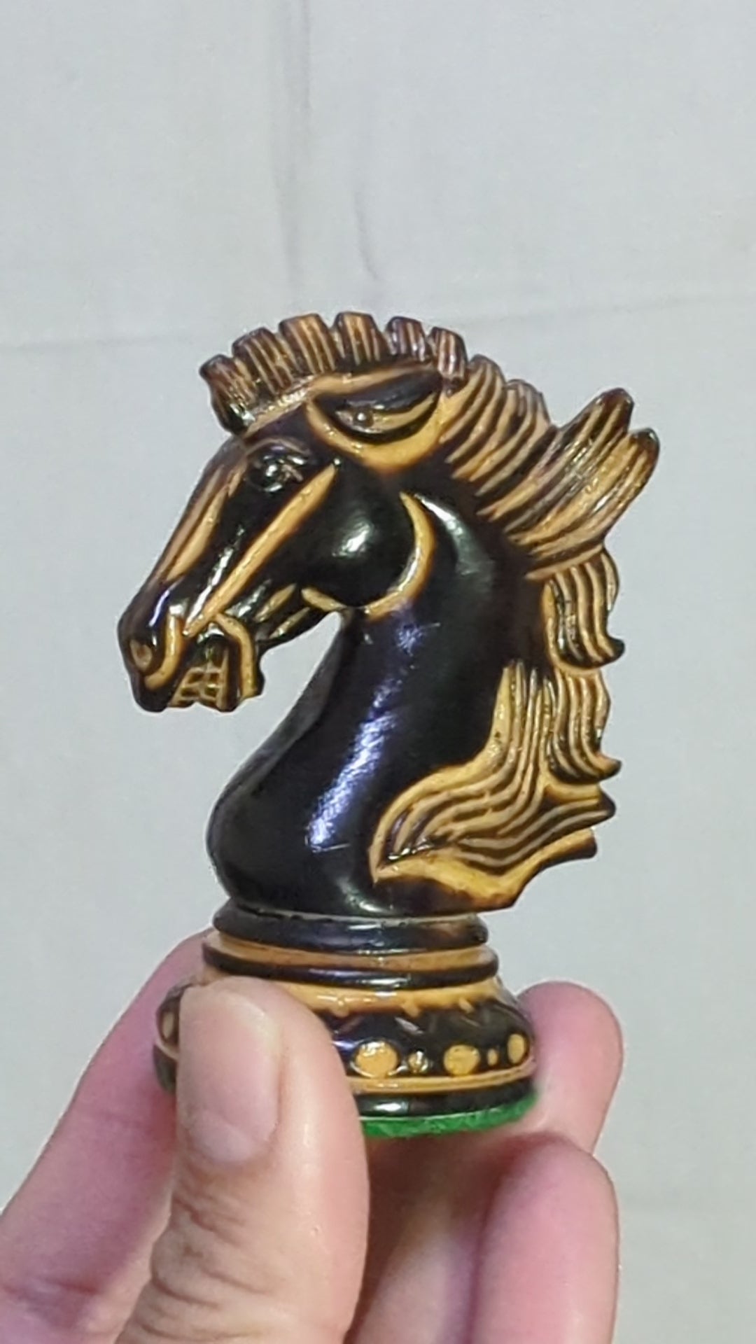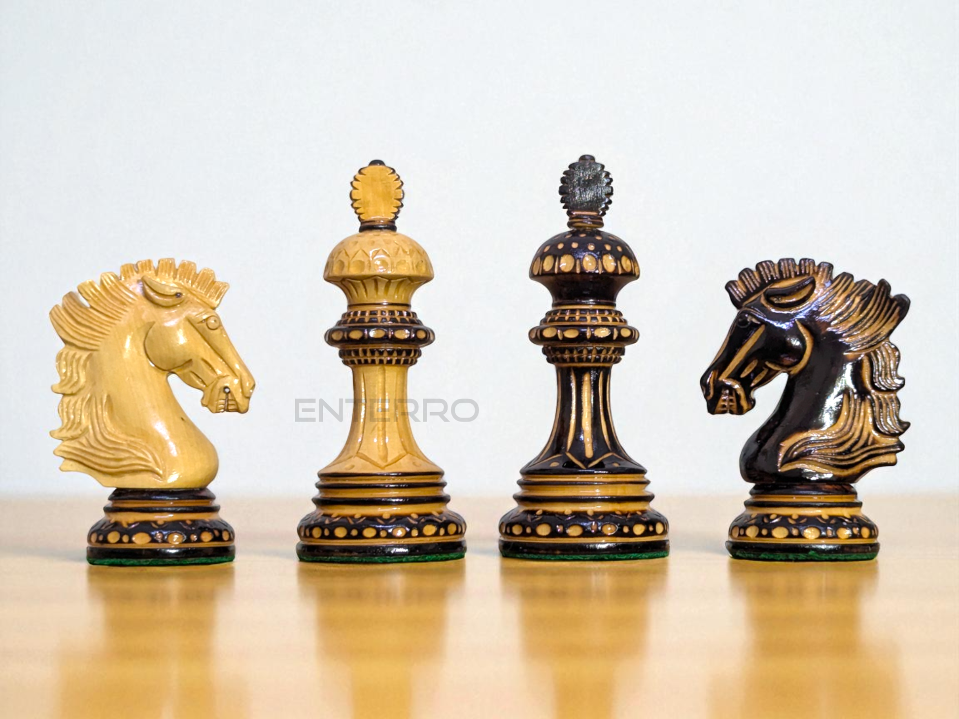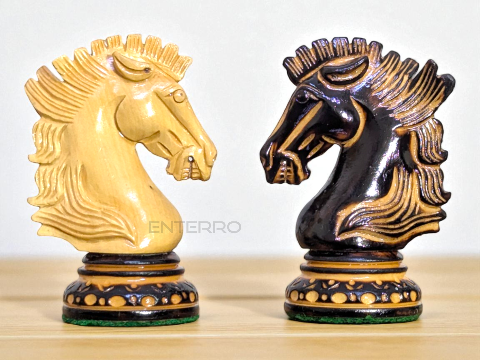 LUXURY WOODEN CHESS PIECES - Purely Handcrafted - Made of Burnt Boxwood and Boxwood. Knight is elegantly carved as a Show Topper on the chess board.